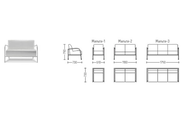 Элегантный дизайн серии Мальта подчёркивает изящная металлическая рама. Регулируемые металлические опоры обеспечивают превосходную устойчивость объёмных форм дивана. В модели удачно сочетаются удивительная легкость и динамизм, так необходимые в современном интерьере общественного помещения. Каркас, выполненный из нержавеющей стали или стали с полимерным покрытием, гарантирует надёжную длительную эксплуатацию. Серия состоит из кресла, двухместного и трёхместного дивана.